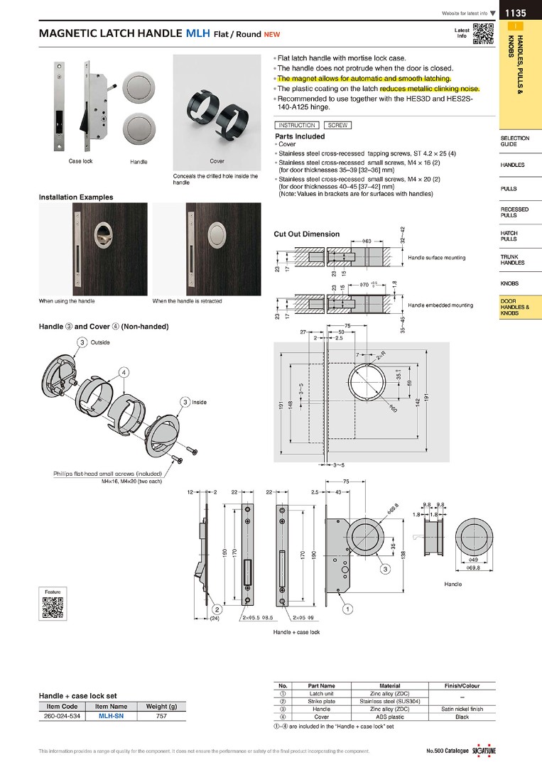 (Примечание: Значения в скобках указаны для поверхностей с ручками) - В сочетании со скрытыми петлями серии HES можно создать современный и лаконичный дизайн двери. Магнитное притяжение автоматически фиксирует дверь, обеспечивая плавное и бесшумное открывание и закрывание. Кроме того, защелка с полимерным покрытием исключает любые металлические звуки, обеспечивая тихую работу.