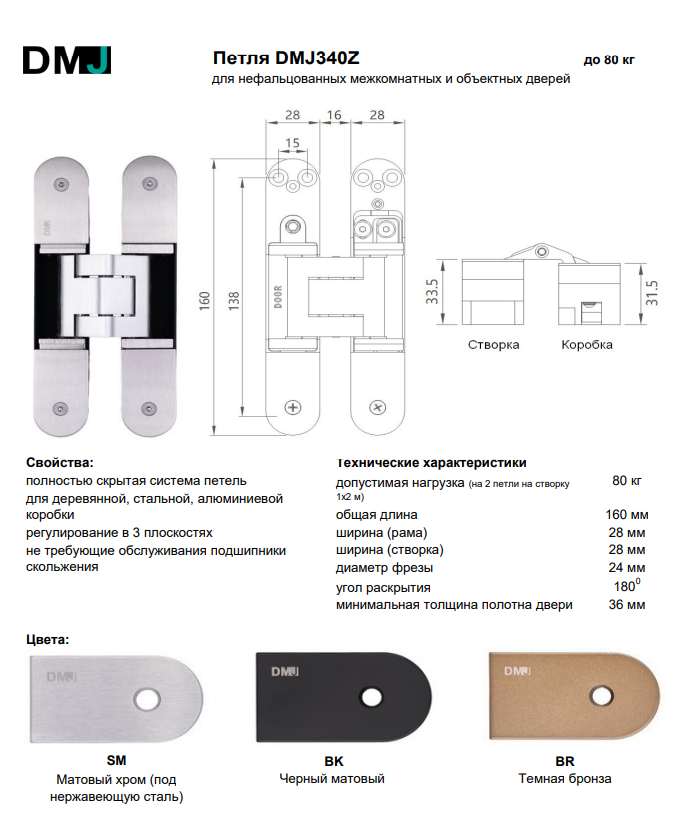 Скрытые петли DMJ для нефальцованных дверей, 3D регулировка, весом до 80 кг. цвет хром матовый