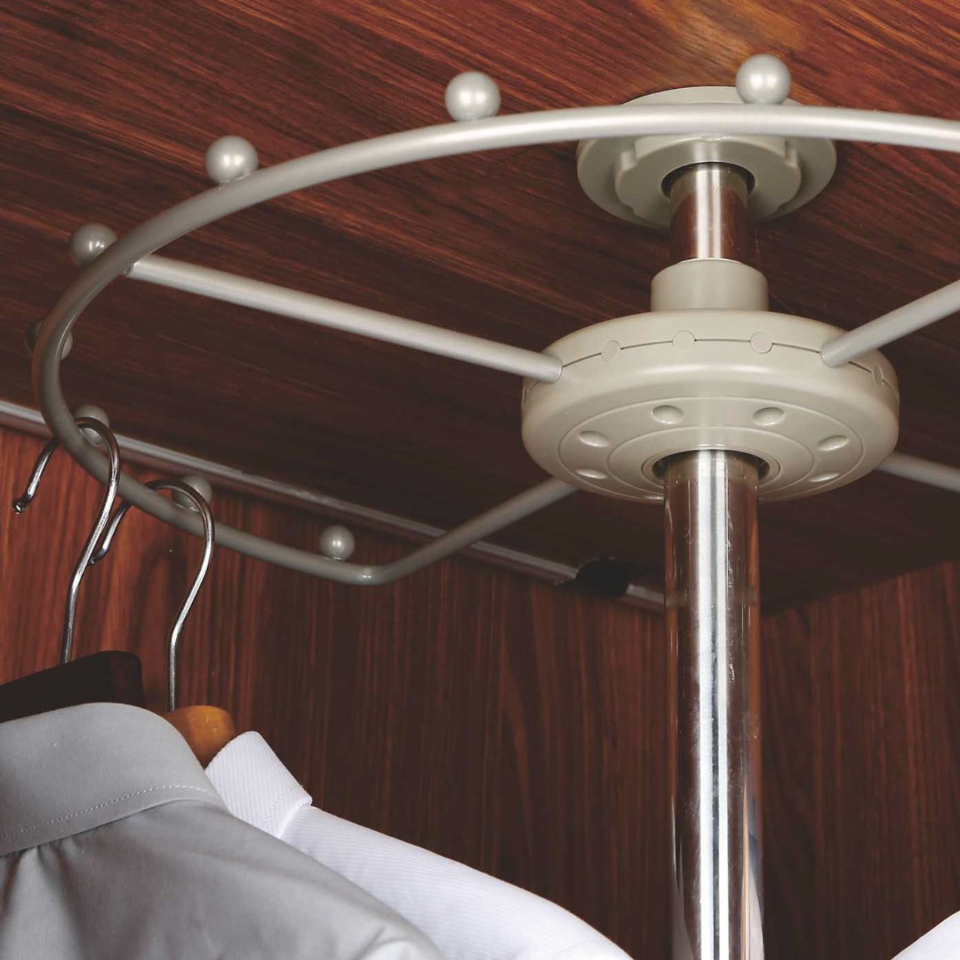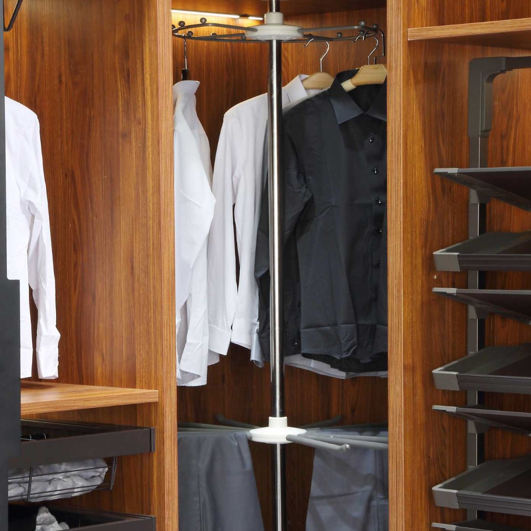 Трехуровневая вращающаяся корзина - оптимальное решение для наполнения внутреннего пространства шкафа. Она хорошо подходит для встраивания в угол или в шкаф небольшого размера. С помощью вращающейся корзины на площади до 1 квадратного метра можно комфортно разместить наплечную одежду (например рубашки, кофты, куртки), брюки и обувь. С такой фурнитурой в шкафу не будет "глухих" пространств.