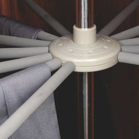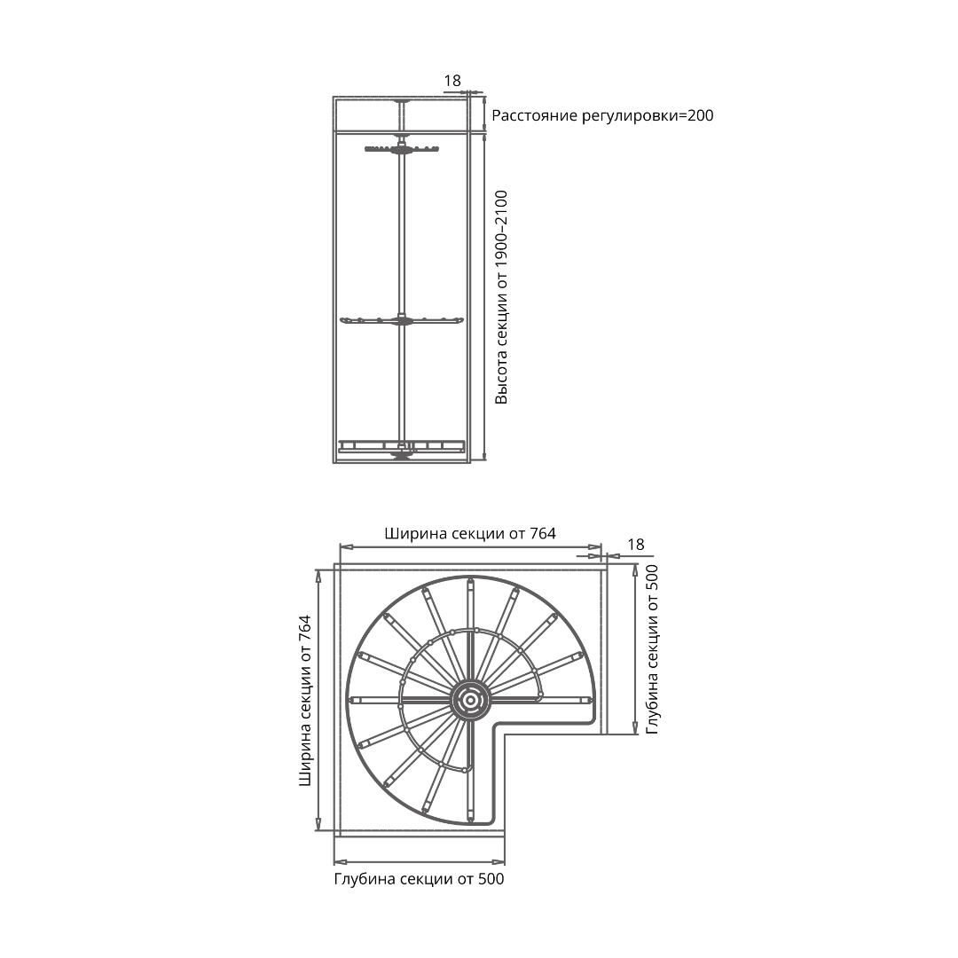 Все детали трехуровневой корзины для шкафа-купе качественно сделаны и тщательно подогнаны. Она вращается легко и бесшумно. Материал изготовления алюминий с напылением. Подходит для шкафов с шириной от 80 см. Фиксация трехуровневой корзины производится путем привинчивания нижнего крепления к полу секции, верхнего - к потолку. Высота варьируется в пределах 1900-2100 мм