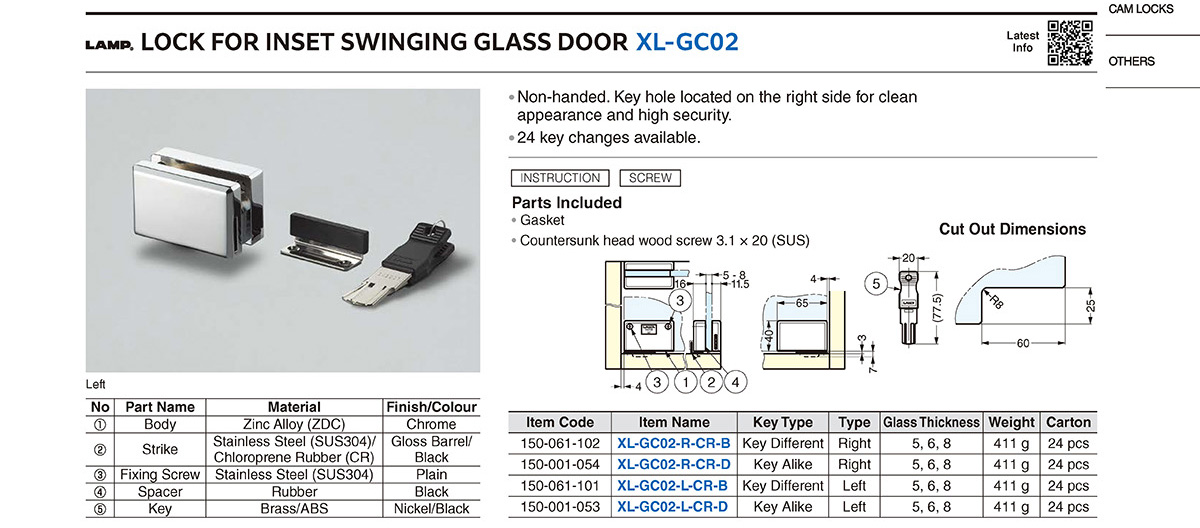 Замок правый, для стекла толщиной 5-8 мм, Sugatsune модель XL-GC02-R-CR-B цвет матовый хром