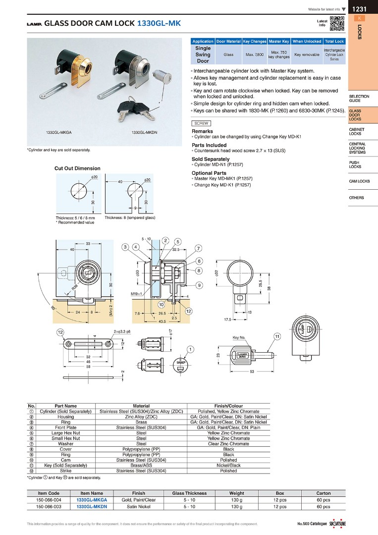 Замок для стекла толщиной 5-10 мм, Sugatsune модель 1330GL-MKDN цвет матовый никель (угол поворота ключа 90°, разная комбинация ключей)
