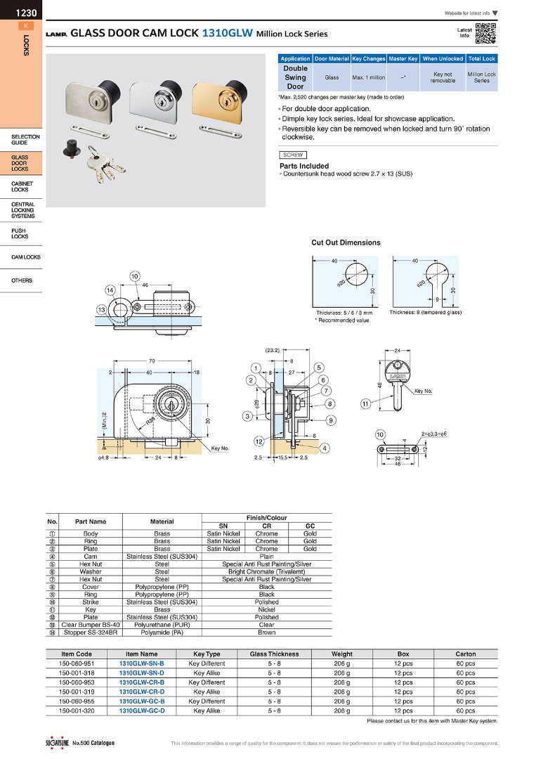 Замок для стекла толщиной 5-8 мм, Sugatsune модель 1310GLW-SN-B цвет матовый никель (угол поворота ключа 90°, разная комбинация ключей)