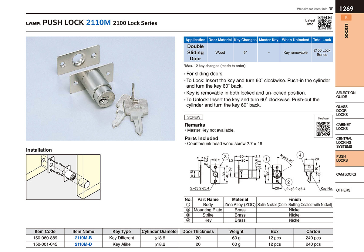 Нажимной замок 2110M-D для раздвижных дверей толщиной до 25 мм (одинаковая комбинация ключей)