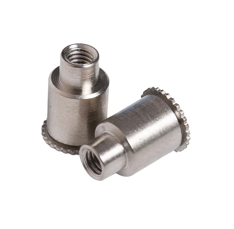 Использование токарной обработки материала из углеродистой стали с головкой с зубчатой формой для клепки под давлением в отверстии в частях шпильки из тонкого листового металла в соответствии с потребностями обработки различных спецификаций таких деталей.
