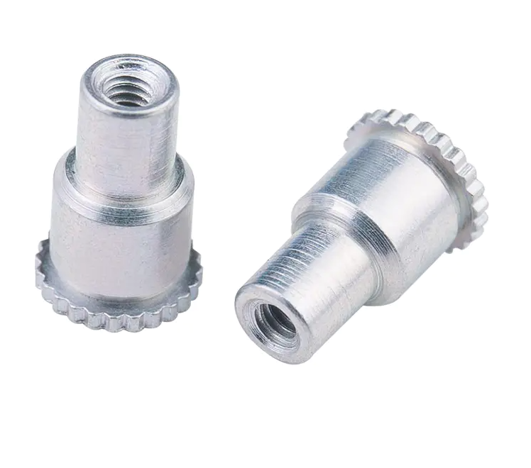 Использование токарной обработки из углеродистой стали, изготовленной из головки с зубчатой формой, с цилиндрическим корпусом, для клепки давлением в пластине с отверстиями в золотых деталях, для определения положения сборки компонентов гайки, в соответствии с потребностями обработки различных спецификаций этого типа деталей.