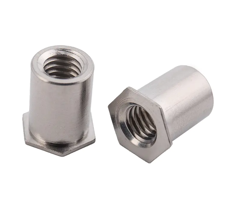 Использование токарных материалов из углеродистой стали изготовлено из своеобразной шестиугольной головки, основной корпус цилиндрический, через отверстие не проходят зубцы конструкции. Он действует как армирование и усиление путем клепания к компонентам из листового металла. Заклепочная гайка под давлением, соединяющая резьбу с металлической пластиной, образует прочную опорную конструкцию, фиксирующая сила становится более прочной и долговечной.